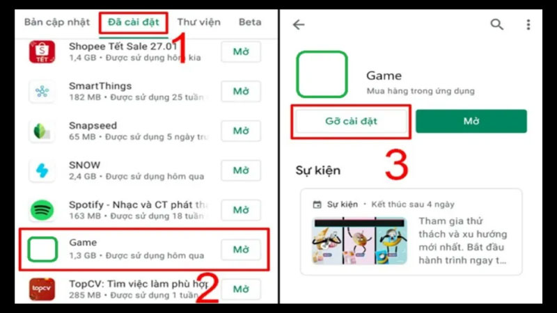 - Bước 4: Chọn Gỡ cài đặt để xóa hoàn toàn game khỏi thiết bị.
