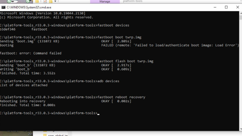 - Hoặc bạn có thể dùng lệnh trong Command Prompt: fastboot boot twrp.img. Lệnh này sẽ tạm thời khởi động vào TWRP mà không cần cài đặt. (Hữu ích để kiểm tra file TWRP trước khi flash).