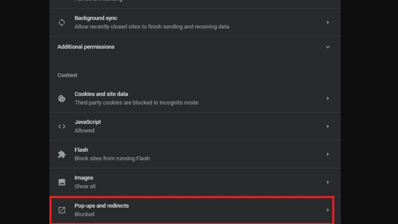- Cuộn xuống phần “Content” (Nội dung) và nhấp vào “Pop-ups and redirects” (Cửa sổ bật lên và liên kết chuyển hướng).