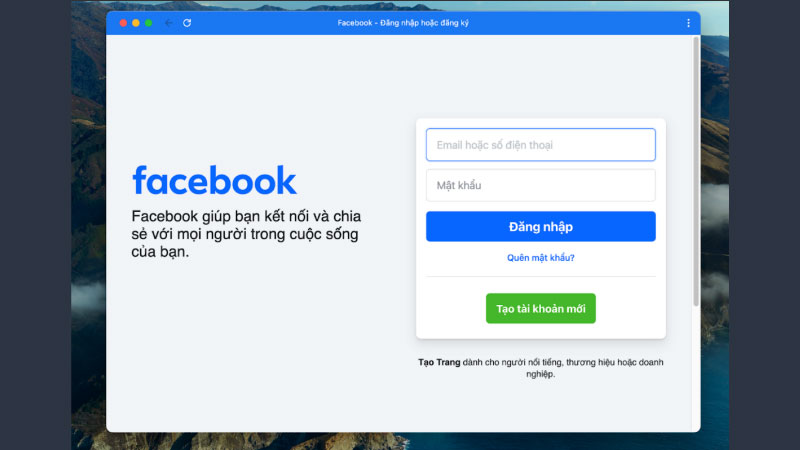 Bước 4: Đăng nhập vào tài khoản Facebook Sau khi ứng dụng đã được cài đặt xong, click vào biểu tượng Facebook trên Dock hoặc trong thư mục Ứng dụng để mở. Khi giao diện Facebook hiển thị, nhập thông tin tài khoản và mật khẩu của bạn vào các ô tương ứng để đăng nhập. Nhấn vào nút “Login” (Đăng nhập) và bạn đã sẵn sàng sử dụng Facebook trên MacBook của mình.