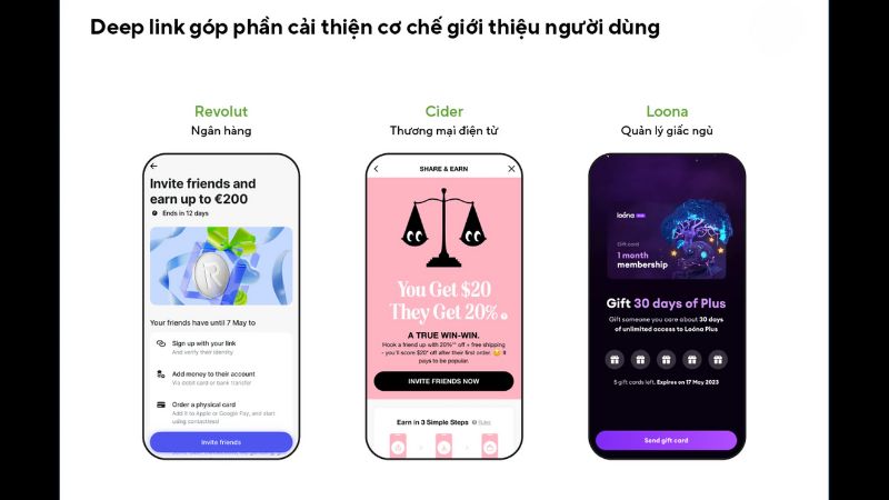 Khả năng này mở ra vô vàn ứng dụng cho marketer. Bạn có thể tạo ra các trải nghiệm được cá nhân hóa cao độ. Ví dụ, một người dùng nhấp vào link giới thiệu từ bạn bè. Khi họ mở app, họ sẽ thấy một màn hình chào mừng “Chào mừng bạn, [Tên bạn bè] đã tặng bạn một voucher giảm giá 20%”. Đồng thời, hệ thống cũng tự động ghi nhận và cộng thưởng cho người đã giới thiệu.