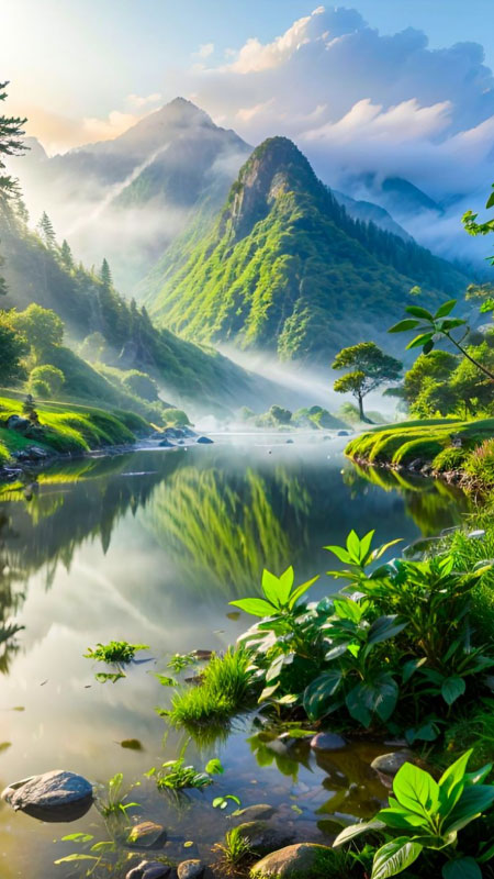 Những dòng sông uốn lượn quanh co qua núi rừng hay đồng bằng được mô phỏng dòng chảy tự nhiên. Thác nước đổ từ trên cao xuống với hiệu ứng tung bọt trắng xóa, hơi nước mờ ảo xung quanh. Độ phân giải cao của ảnh thiên nhiên đẹp 3d cho thấy rõ từng giọt nước, sự trong trẻo của dòng suối. Ánh sáng phản chiếu trên mặt nước tạo hiệu ứng lấp lánh, mang lại cảm giác mát mẻ, thanh khiết.