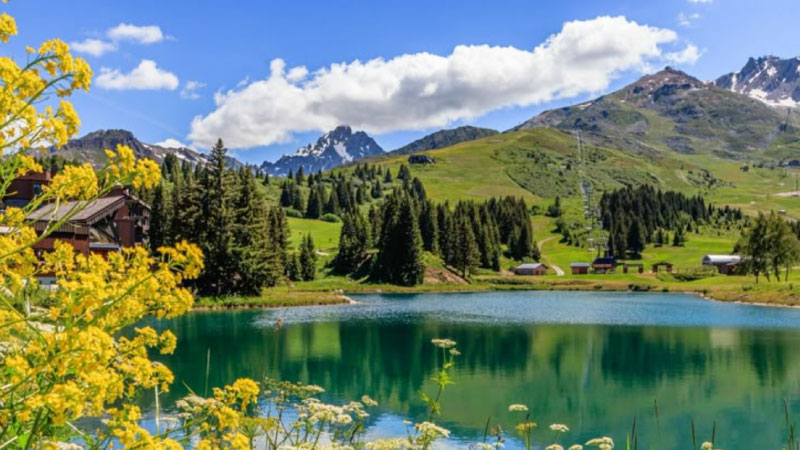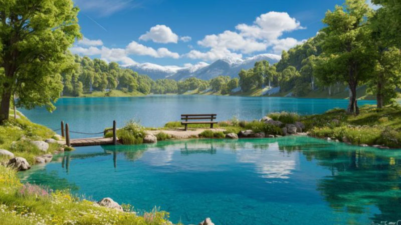 - Phong cảnh thiên nhiên mùa xuân: Rừng cây xanh mướt, con đường ngập nắng, hồ nước tĩnh lặng phản chiếu bầu trời xanh. Những khung cảnh này mang đến cảm giác thư giãn, dễ chịu và mở rộng không gian thị giác.