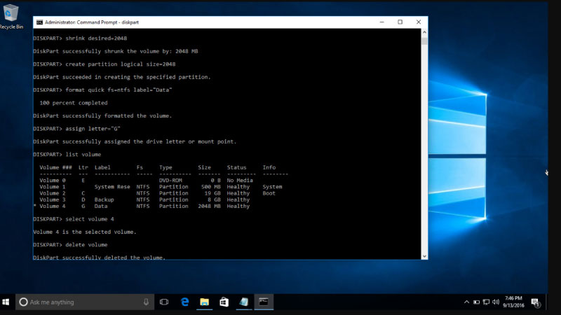 - Gõ lệnh create partition primary để tạo lại phân vùng mới.