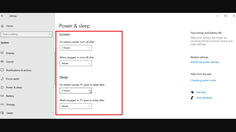- Bước 3: Tại đây, bạn sẽ thấy các tùy chọn để thiết lập thời gian tự động tắt màn hình. Khi dùng pin (“On battery power, turn off my screen after”) và khi cắm sạc. (“When plugged in, turn off my screen after”).