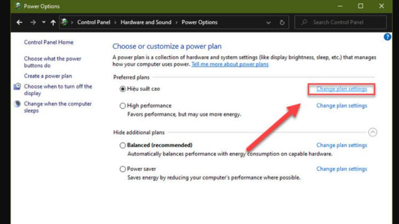 Kế hoạch sử dụng năng lượng (Power Plan) của Windows ảnh hưởng đến hiệu suất của CPU và các linh kiện. Nếu máy tính đang ở chế độ Tiết kiệm pin (Power saver) hoặc Cân bằng (Balanced). Hiệu năng có thể bị giới hạn, làm giảm FPS khi chơi game. Hãy vào Control Panel > Hardware and Sound > Power Options. Chọn chế độ “High performance” (Hiệu năng cao) để đảm bảo CPU và GPU luôn hoạt động ở mức tối đa. Với laptop, bạn có thể tạo một Power Plan riêng để chỉ kích hoạt khi cắm sạc.