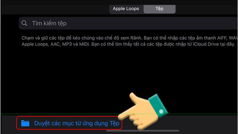 Khởi động ứng dụng GarageBand và chọn biểu tượng dấu cộng để bắt đầu tạo ra một dự án. Chọn mục bộ thu âm thanh từ danh sách các công cụ hỗ trợ sáng tác nhạc chuyên nghiệp. Nhấn vào biểu tượng các rãnh nhạc ở góc trái màn hình để chuyển sang giao diện chỉnh sửa. Tìm kiếm biểu tượng vòng lặp ở góc phải màn hình để thực hiện cách cài nhạc chuông cho iphone. Chọn tab tệp tin và nhấn vào dòng chữ duyệt các mục từ ứng dụng Tệp hiện nay. Tìm đúng bản nhạc đã chuẩn bị từ trước và kéo thả vào không gian làm việc chính.