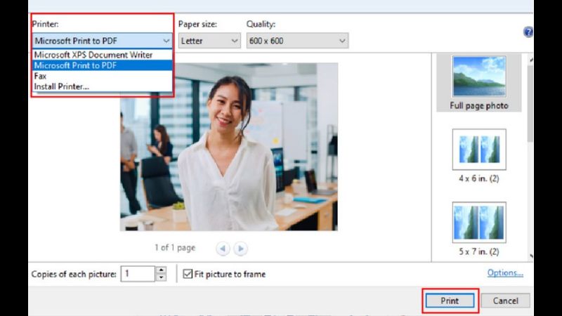 - Bước 5: Cửa sổ “In ảnh” (Print Pictures) sẽ hiện ra. Đây là bước quan trọng nhất. Tại mục “Máy in” (Printer), hãy nhấn vào menu thả xuống và chọn “Microsoft Print to PDF”.