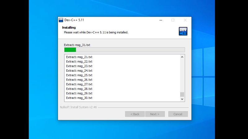 Một thanh tiến trình màu xanh sẽ chạy trên màn hình. Quá trình này mất khoảng 30 giây đến 1 phút tùy tốc độ máy. Khi chạy xong, cửa sổ “Completing the Dev C++ Setup Wizard” sẽ hiện ra.