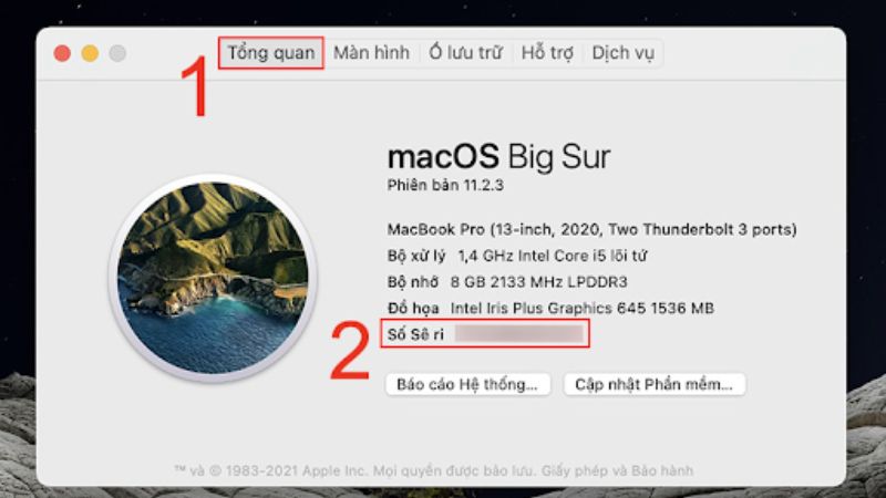 - Vào logo Apple ở góc trái -> About This Mac. Ghi lại số Serial.