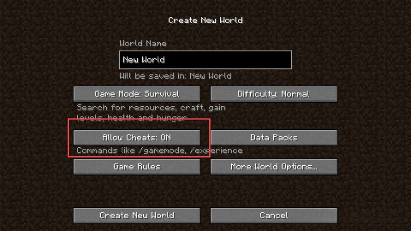 Khi tạo thế giới mới: Trong bảng cài đặt “Create New World”, hãy tìm mục “Allow Cheats”. Gạt công tắc sang chế độ “ON” (Bật).