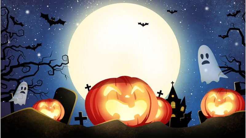 - Ảnh nền hoạt hình Halloween với tông màu cam, đen đặc trưng